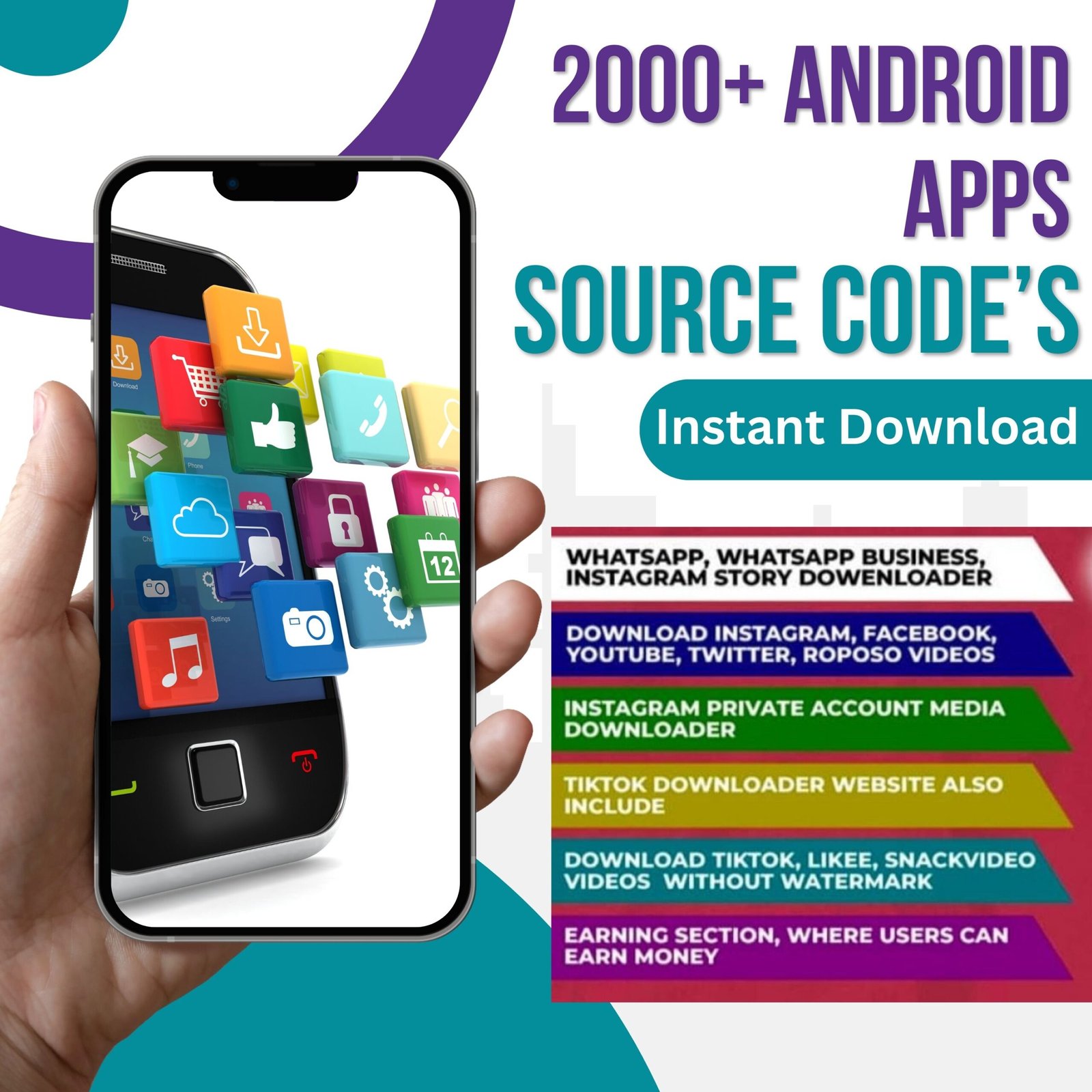 This bundle has source code of android apps like instagram story downloader, whatsapp status downloader, Tinder and many more. Also source code for chatting apps and video + photo editing apps.